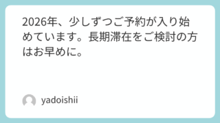 宿いしい|合川町の宿泊情報 2026年、少しずつご予約が入り始めています。長期滞在をご検討の方はお早めに。